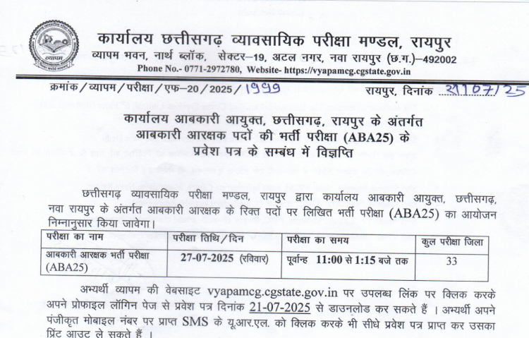 छत्तीसगढ़ व्यावसायिक परीक्षा मण्डल द्वाराआबकारी आरक्षक छत्तीसगढ़, नवा रायपुर के अंतर्गत लिखित भर्ती परीक्षा (ABA25) का आयोजन दिनांक 27-07-2025 (रविवार) को किया जावेगा।