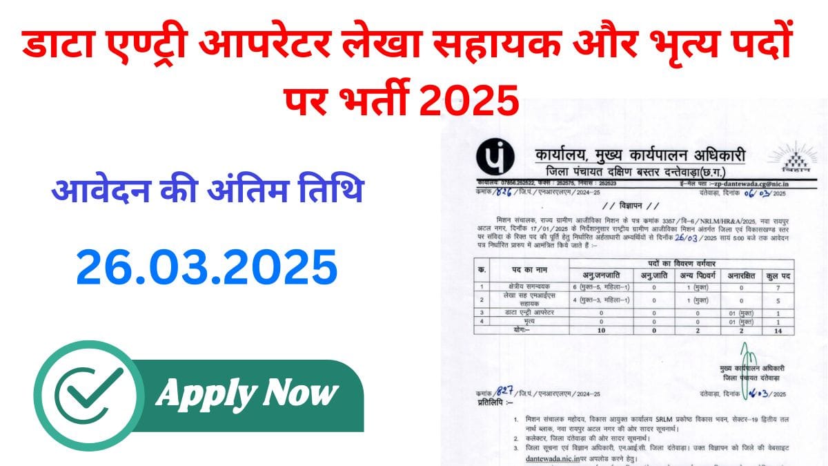 Dantewada Jila Panchayat Vacancy 2025: दन्तेवाड़ा जिला पंचायत में डाटा एण्ट्री आपरेटर लेखा सहायक और भृत्य पदों पर भर्ती 2025