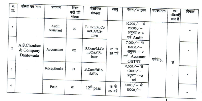 दिनांक 14/05/2025 दिन बुधवार को कार्यालय जिला रोजगार एवं स्व रोजगार मार्गदर्शन केन्द्र दंतेवाड़ा में प्रातः 11:00 बजे से शाम 03:00 बजे तक प्लेसमेंट कैम्प का आयोजन किया जा रहा है। प्लेसमेंट कैम्प हेतु निम्नानुसार रिक्तियां प्राप्त हुई है, इच्छुक आवेदक/आवेदिका प्रातः 11:00 से 04:00 बजे तक निर्धारित स्थल पर अपनी समस्त शैक्षणिक दस्तावेजों की मूल प्रतियां, एक सेट छायाप्रतियां, एक पासपोर्ट साईज फोटोग्राफ सहित, उपस्थित होकर अवसर का लाभ ले सकते है। यह आयोजन पूर्णतः निःशुल्क है। रिक्तियों का विवरण निम्नानुसार है:-
