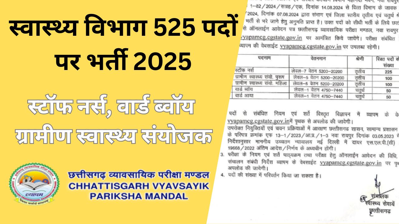 छत्तीसगढ़ व्यापम स्वास्थ्य विभाग 525 पदों पर भर्ती विज्ञापन जारी | CG Vyapam Health Department Vacancy 2025