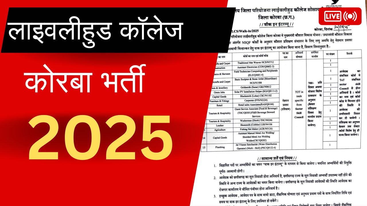 Livelihood College Korba Bharti 2025: लाइवलीहुड कॉलेज कोरबा में मेहमान प्रवक्ता पदों पर वॉक इन इंटरव्यू भर्ती