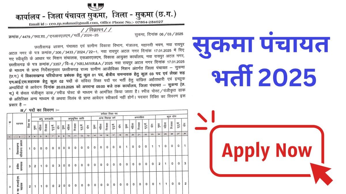 Sukma Jila Panchayat Vacancy 2025: सुकमा जिला पंचायत में विकासखण्ड प्रबंधक क्षेत्रीय समन्वयक और लेखा सहायक के पदों पर भर्ती 2025